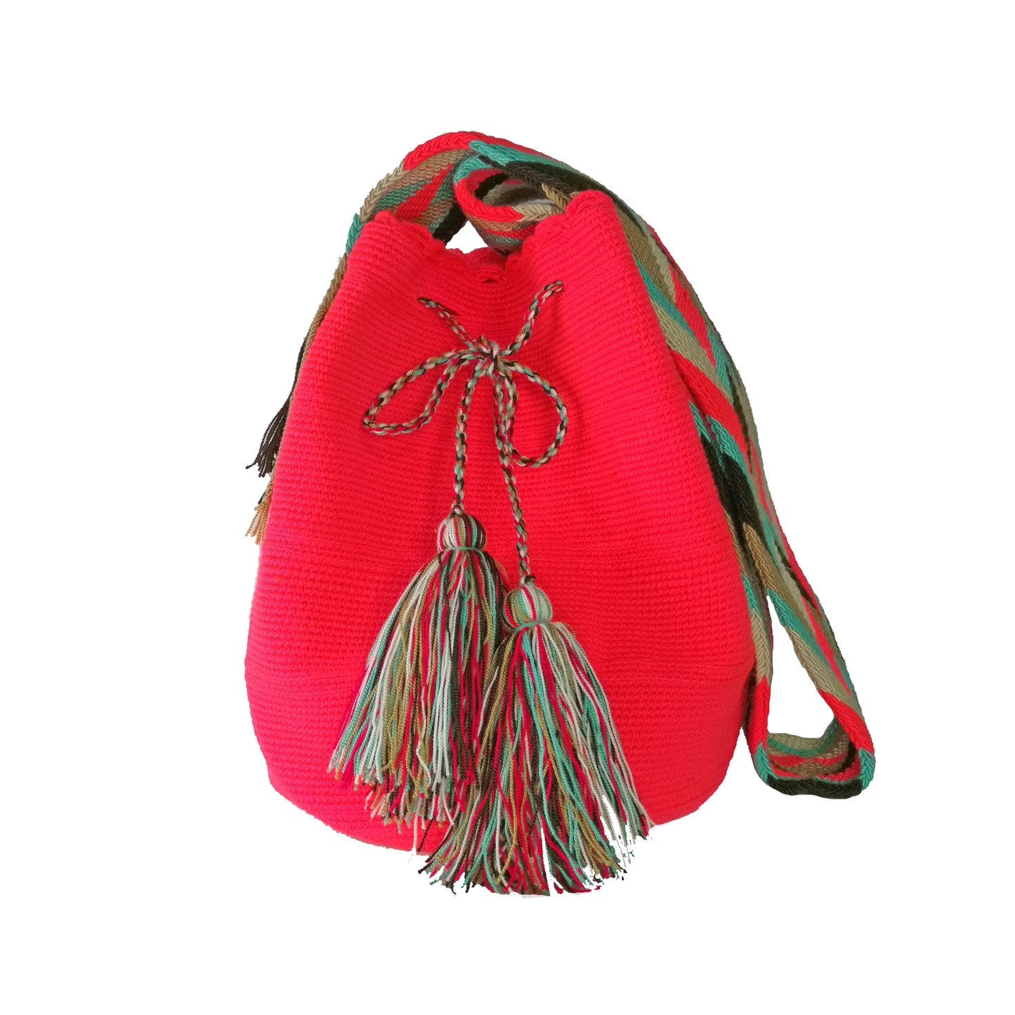 Bolso de dos hilos tejido a mano por mujeres artesanas Wayuu durante 8 - 10 días utilizando una técnica ancestral propia de la comunidad. Los colores y símbolos de la bolsa representan sus tradiciones y preservan su cultura. Este bolso está hecho a mano y es único.