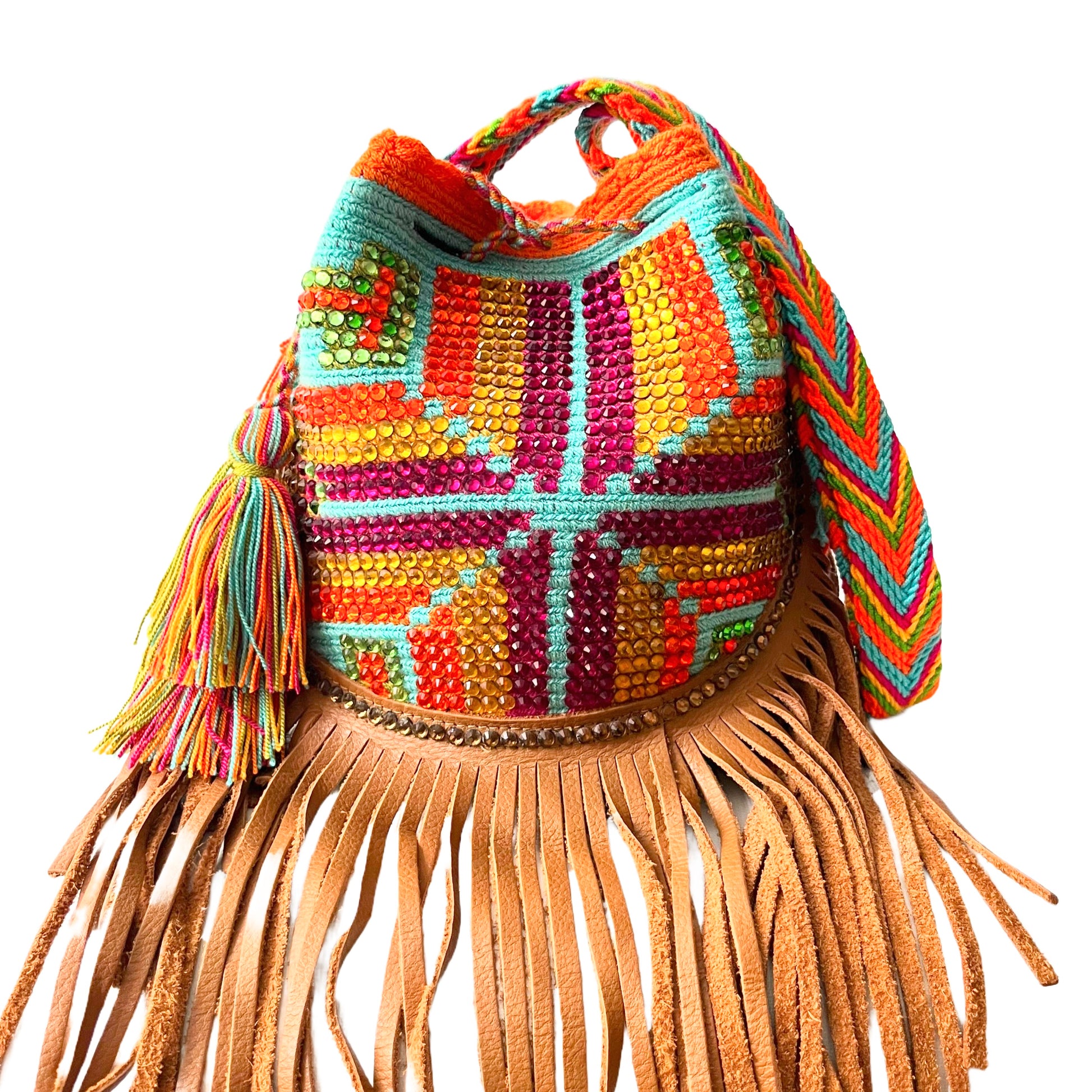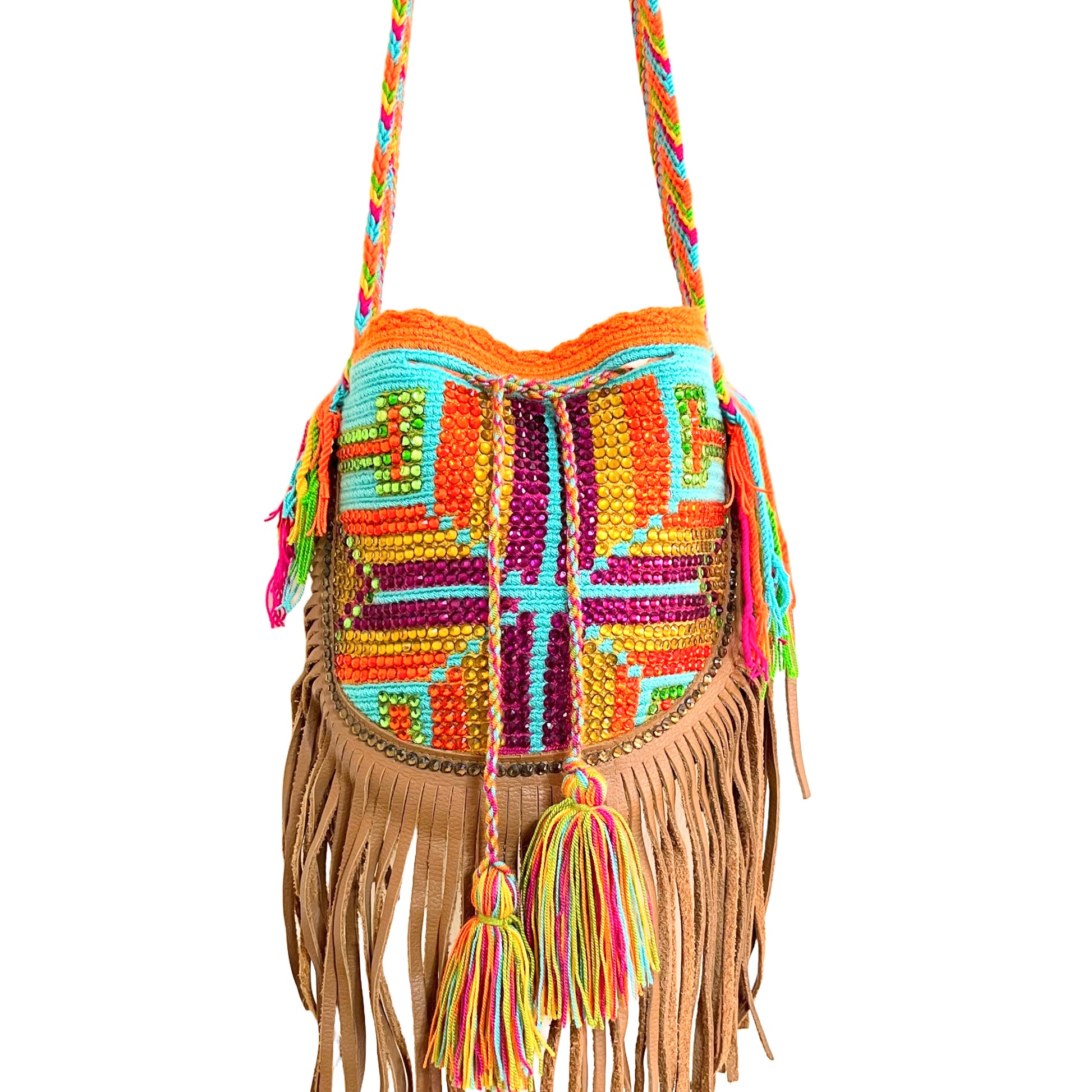 Two thread bag handwoven by Wayuu artisans women during 8 - 10 days using an ancestral technique community's own. Decorated with crystals placed one by one. The bag's colors and symbols represent their traditions and preserve their culture. This bag is handmade and one-off.